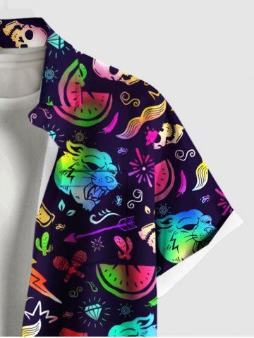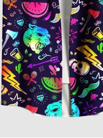 Plus Size Colorful Ombre Monster Skull Watermelon Lightning Cactus Print Hawaii Button Pocket Shirt For Men - Black - M