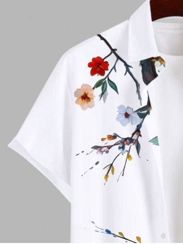 Short Sleeves Shirts > Plus Size Colorful Watercolor Floral Leaf Branch Print Hawaii Button Pocket Shirt For Men