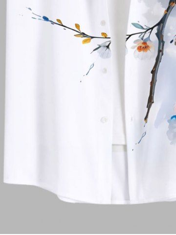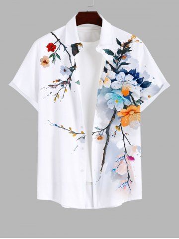 Plus Size Colorful Watercolor Floral Leaf Branch Print Hawaii Button Pocket Shirt For Men - White - 3xl