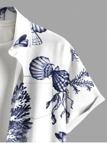 Short Sleeves Shirts > Plus Size Conch Shell Coral Starfish Print Hawaii Sea Creatures Button Pocket Shirt For Men