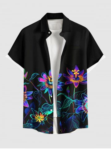 Plus Size Daisy Flowers Leaf Neon Print Buttons Pocket Hawaii Shirt For Men - Black - 5xl