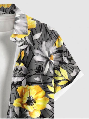 Plus Size Daisy Flowers Leaf Print Buttons Pocket Hawaii Shirt For Men - Yellow - M