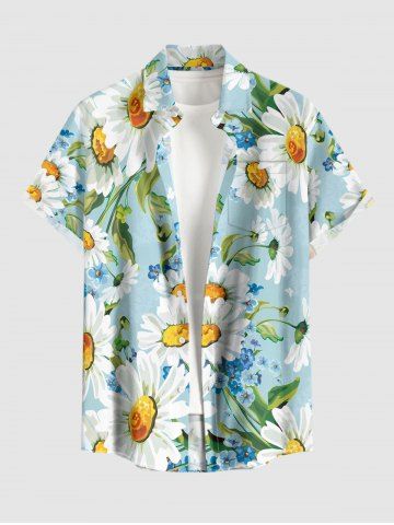 Plus Size Daisy Flowers Leaf Print Buttons Pocket Hawaii Shirt For Men - Powder Blue - Xl