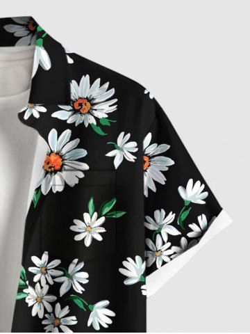 Plus Size Daisy Flowers Print Buttons Pocket Hawaii Shirt For Men - Black - Xl