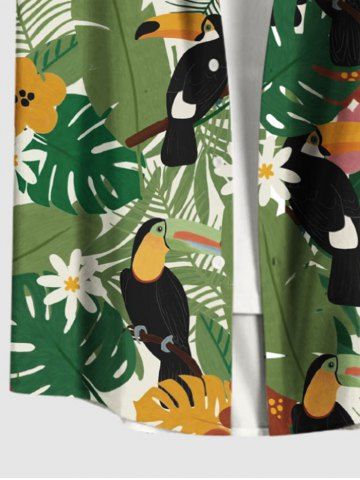 Plus Size Daisy Flowers Tropical Leaf Bird Print Buttons Pocket Hawaii Shirt For Men - Green - 5xl