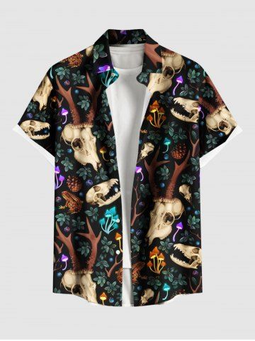 Plus Size Deer Head Mushroom Floral Print Hawaii Button Pocket Shirt For Men - Black - M