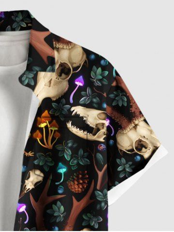 Plus Size Deer Head Mushroom Floral Print Hawaii Button Pocket Shirt For Men - Black - 2xl