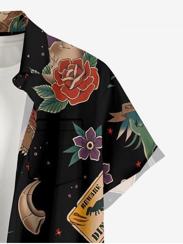 Plus Size Dinosaur Flower Print Hawaii Button Pocket Shirt For Men - Black - Xl