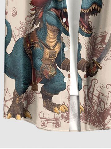 Plus Size Dinosaur Pirate Ship Rudder Print Buttons Pocket Hawaii Shirt For Men - Tan - L