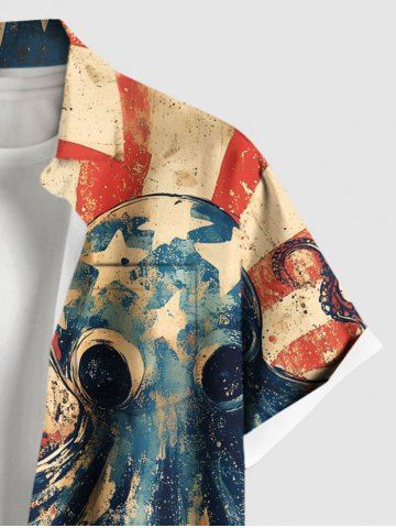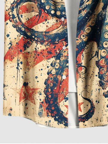 Plus Size Distressed Octopus Patriotic American Flag Print Hawaii Button Pocket Shirt For Men - Light Coffee - L