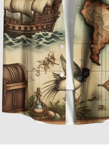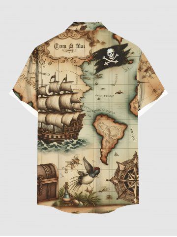 Plus Size Distressed Skull Sailboat Map Steering Wheel Print Hawaii Cruise Button Pocket Shirt For Men - Apricot - S