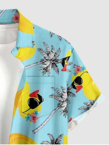 Plus Size Duck Coconut Tree Print Buttons Pocket Hawaii Shirt For Men - Turquoise - S