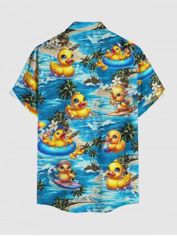 Plus Size Ducks Coconut Tree Flowers Print Buttons Pocket Hawaii Shirt For Men - Blue - M