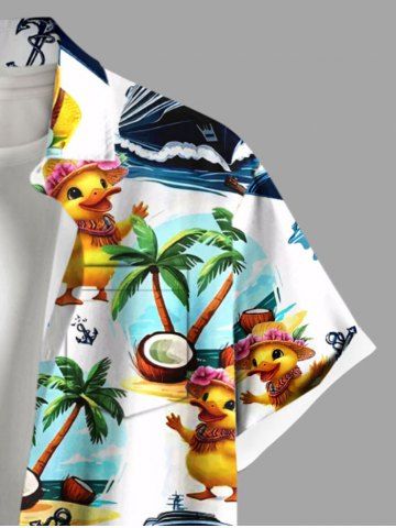Plus Size Ducks Coconut Tree Sea Waves Ship Anchor Cruise Print Buttons Pocket Hawaii Shirt For Men - White - L