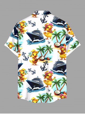 Plus Size Ducks Coconut Tree Sea Waves Ship Anchor Cruise Print Buttons Pocket Hawaii Shirt For Men - White - 2xl
