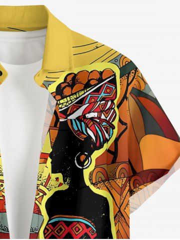 Plus Size Ethnic Lady Sun Print Buttons Pocket Hawaii Shirt For Men - Orange - Xl