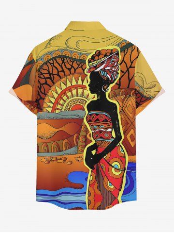 Plus Size Ethnic Lady Sun Print Buttons Pocket Hawaii Shirt For Men - Orange - 4xl