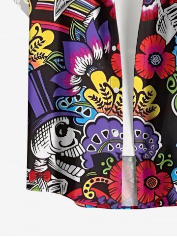 Plus Size Ethnic Skulls Flower Print Hawaii Button Pocket Shirt For Men - Black - Xl