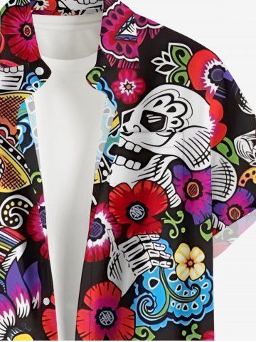 Short Sleeves Shirts > Plus Size Ethnic Skulls Flower Print Hawaii Button Pocket Shirt For Men