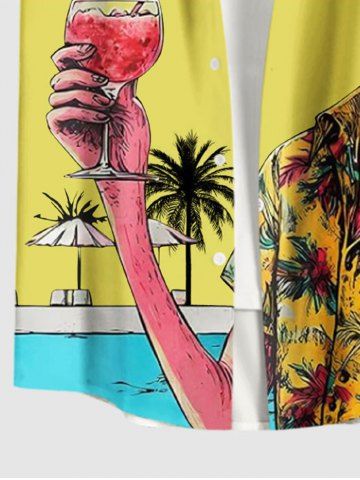 Plus Size Flamingo Coconut Tree Fruit Juice Seascape Print Buttons Pocket Hawaii Shirt For Men - Yellow - M