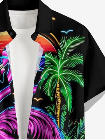 Plus Size Flamingo Coconut Tree Sun Print Buttons Pocket Hawaii Shirt For Men - Black - L