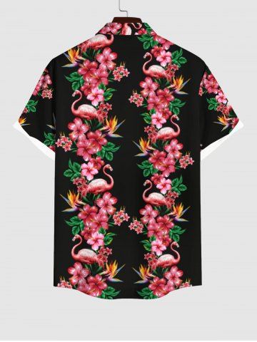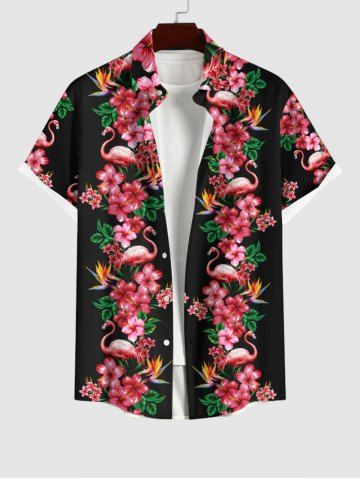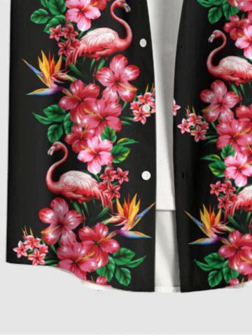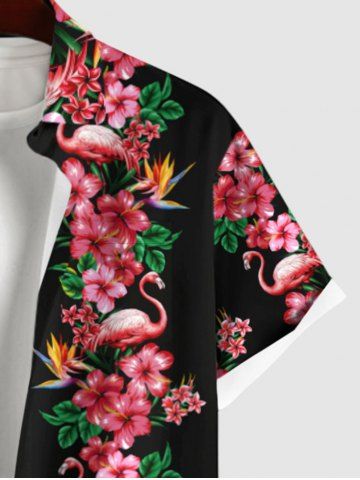 Plus Size Flamingo Floral Tropical Leaves Print Hawaii Button Pocket Shirt For Men - Black - 2xl