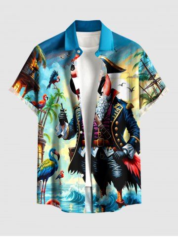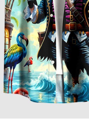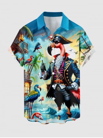 Short Sleeves Shirts > Plus Size Flamingo Pirate Coconut Tree Sea Waves Print Hawaii Button Pocket Shirt For Men
