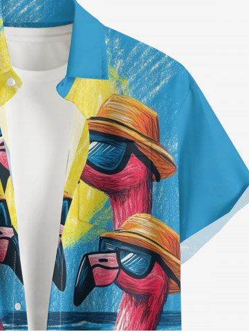 Plus Size Flamingo Sea Sun Painting Print Hawaii Button Pocket Shirt For Men - Light Blue - L