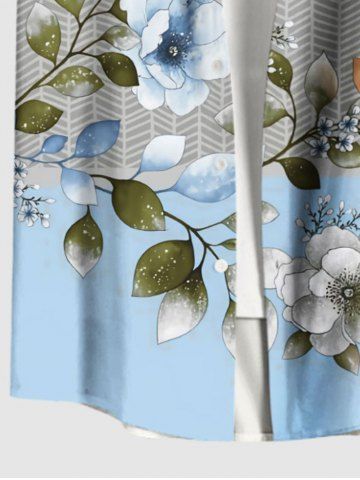 Plus Size Flower Leaf Branch Herringbone Stripe Print Hawaii Button Pocket Shirt For Men - Gray - Xl