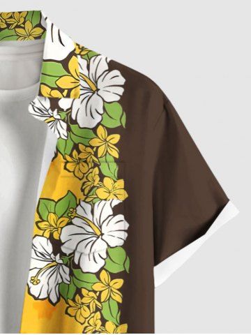 Plus Size Floral Leaves Contrast Colorblock Print Hawaii Button Pocket Shirt For Men - Yellow - S