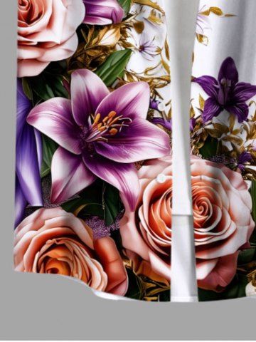 Plus Size Flower Leaf Print Hawaii Button Pocket Shirt For Men - Purple - M