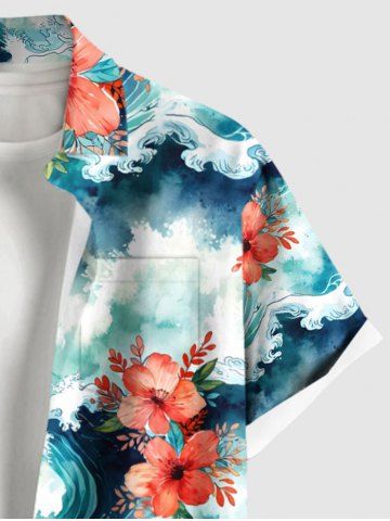 Short Sleeves Shirts > Plus Size Floral Ombre Sea Waves Print Hawaii Button Pocket Shirt For Men