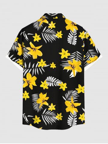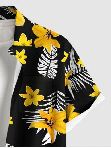 Plus Size Flower Tropical Leaf Print Hawaii Button Pocket Shirt For Men - Black - S