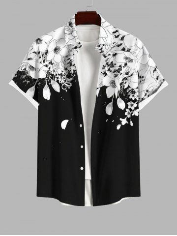 Plus Size Floral Two Tone Print Hawaii Button Pocket Shirt For Men - Black - S