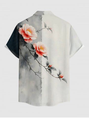Plus Size Flower Branch Ink Painting Print Hawaii Button Pocket Shirt For Men - White - 3xl