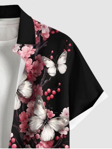 Plus Size Flower Butterfly Print Hawaii Button Pocket Shirt For Men - Black - M