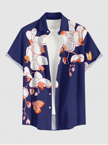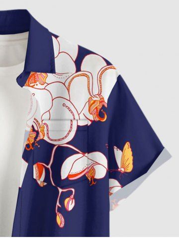 Plus Size Flower Butterfly Print Hawaii Button Pocket Shirt For Men - Deep Blue - S