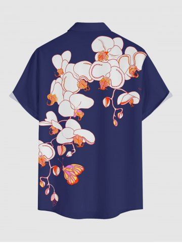 Plus Size Flower Butterfly Print Hawaii Button Pocket Shirt For Men - Deep Blue - L