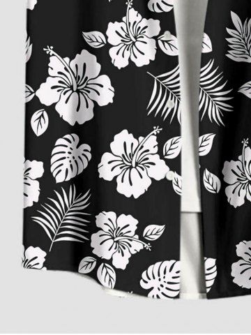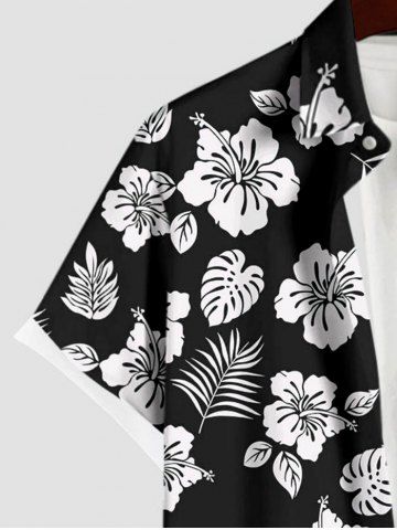 Plus Size Tropical Leaf Hibiscus Flower Print Hawaii Button Pocket Shirt For Men - Black - S
