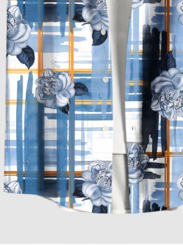 Plus Size Flower Ink Painting Plaid Colorblock Print Hawaii Button Pocket Shirt For Men - Blue - 6xl