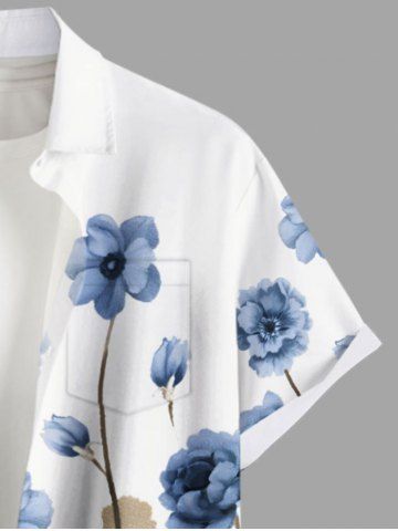 Plus Size Flower Leaf Branch Print Hawaii Button Pocket Shirt For Men - White - 4xl