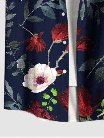 Plus Size Flower Leaf Branch Print Hawaii Button Pocket Shirt For Men - Black - L