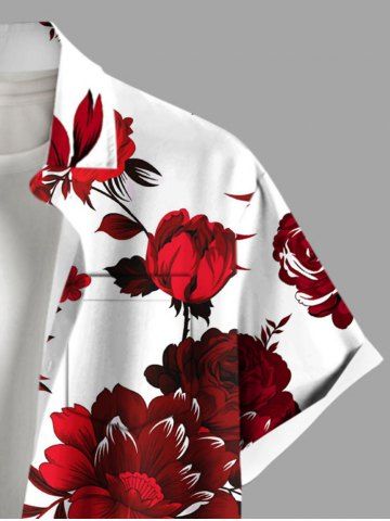 Plus Size Flower Leaf Branch Print Hawaii Button Pocket Shirt For Men - White - M