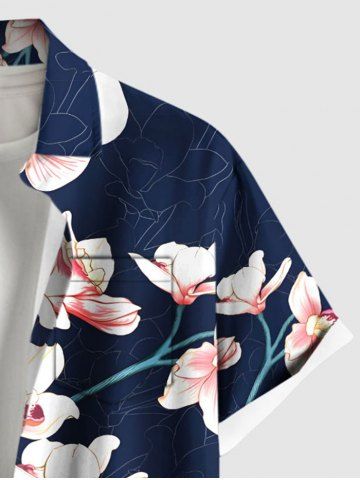 Plus Size Flower Leaf Branch Print Hawaii Button Pocket Shirt For Men - Navy Blue - 5xl