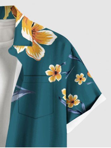 Plus Size Flower Leaf Branch Print Hawaii Button Pocket Shirt For Men - Green - Xl