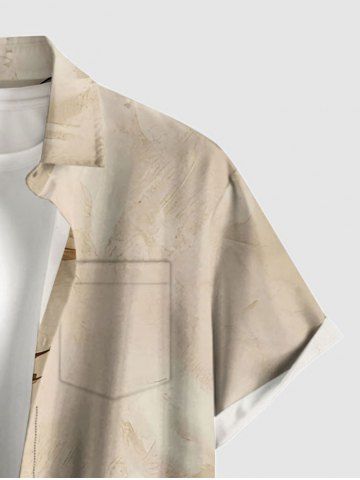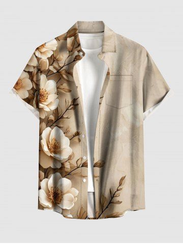 Plus Size Flower Leaf Branch Print Hawaii Button Pocket Shirt For Men - Light Coffee - 3xl