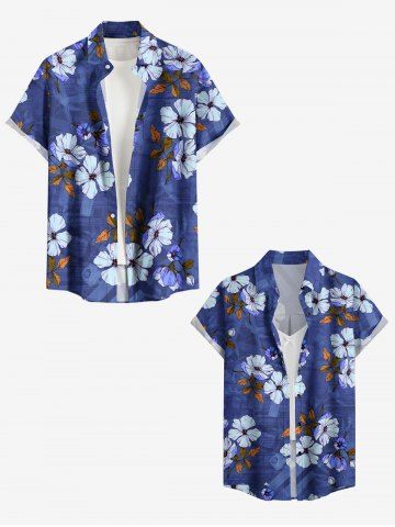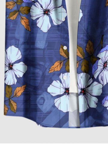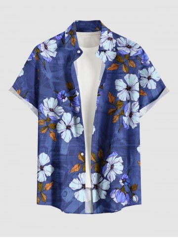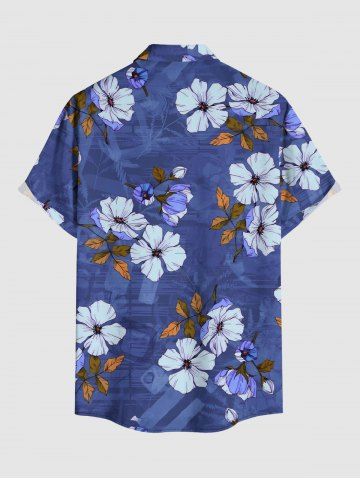 Plus Size Flower Leaf Branch Print Hawaii Button Pocket Shirt For Men - Deep Blue - S