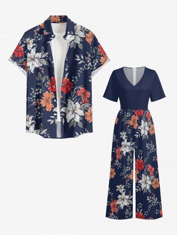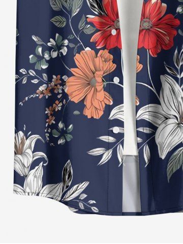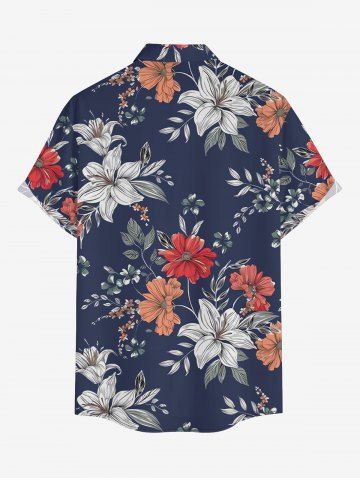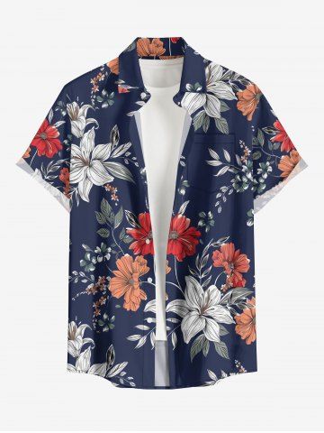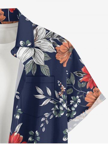 Plus Size Flower Leaf Branch Print Hawaii Button Pocket Shirt For Men - Midnight Blue - S