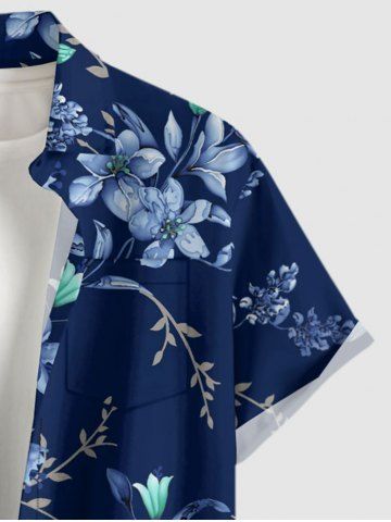 Plus Size Flower Leaf Branch Print Hawaii Button Pocket Shirt For Men - Deep Blue - M