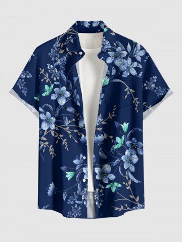 Plus Size Flower Leaf Branch Print Hawaii Button Pocket Shirt For Men - Deep Blue - 2xl